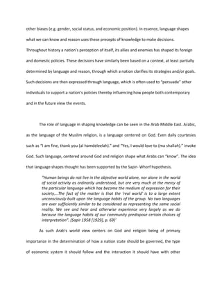 The document discusses the roles of language and reason in shaping history. It argues that language forms the context for how individuals understand the world and make decisions, as it conveys culture and biases. Reason then uses this language-shaped knowledge to arrive at conclusions and determine courses of action. Throughout history, the interplay between a nation's language and reasoning has influenced its policies and interactions with other nations. Language is also crucial for expressing and enforcing reasoned decisions, as seen in propaganda's power to manipulate masses by appealing to emotion. Ultimately, both language and reason shape how events are understood in the present and learned about in the future.