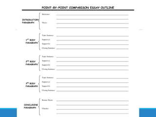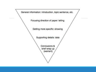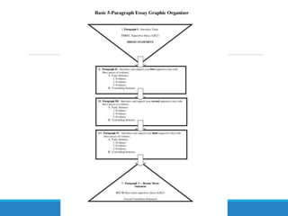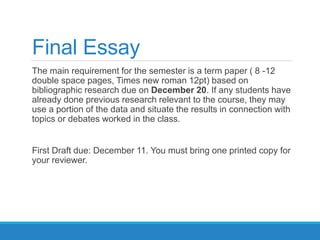 This document provides guidance for students writing an expository essay for a class. It outlines the requirements, including an 8-12 page paper due on December 20th. Students are encouraged to use previous research if relevant. A first draft is due on December 11th. The document then discusses the structure of an expository essay, which includes a clear thesis statement, logical transitions, body paragraphs with evidence, and a conclusion that does not simply restate the thesis. Finally, it provides tips for writing each component of the essay, such as introducing context and importance in the introduction, making the thesis statement specific, including a topic sentence and evidence in each body paragraph, and leaving a final impression in the conclusion.