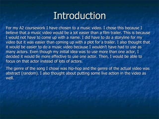 The document summarizes a student's music video project for a class. The student chose to make a hip-hop music video with one actor. They researched techniques used in professional music videos and tried to incorporate conventions like silhouettes, cuts that match the beat, and different camera angles. The student believes their video uses conventions of real music videos but could be improved with more effects. They also made album artwork and packaging that was inspired by existing professional products.