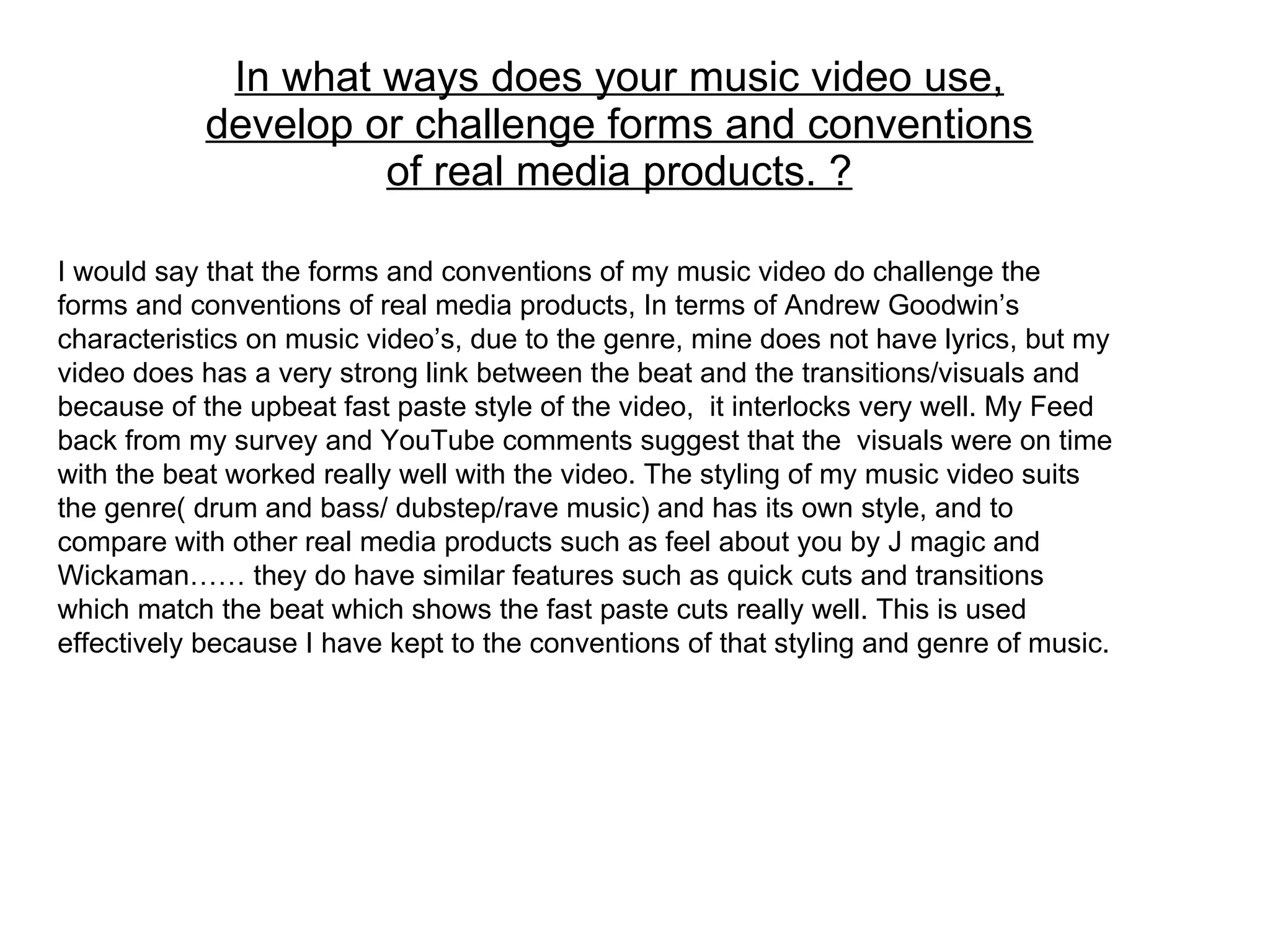 My music video challenges conventions of real media products by not including lyrics but having a strong relationship between the beat and visual transitions that interlock well. Feedback confirmed the visuals worked well with the beat. The fast-paced cuts and transitions suit the drum and bass genre. The visuals change with the beat and music timing, uniting all elements. Scenes in a rave studio use strobing lights and red colors to portray a dance feel. Masked characters running creates an implied narrative that leaves viewers guessing about their destination or purpose. The masks dehumanize the characters and create a mysterious or sinister impression that is enhanced by juxtaposition with an innocent playground setting.
