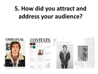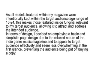 The document discusses how the author attracted and addressed their target audience of 16-24 year olds for their indie music magazine "Original". Key points: