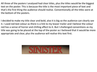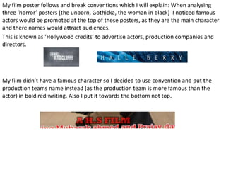 The document discusses conventions used in film posters and magazine covers. It analyzes three horror film posters and three professional magazine covers to identify commonly used design elements. For the film poster, it places the production company name at the bottom in red instead of famous actors at the top. It also puts the title in red at the top rather than the bottom. For the magazine cover, it uses a large red masthead at the top like the professional examples. It also includes the movie title in white below the main image to link it like the examples.