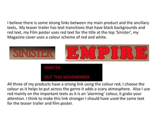The document discusses the effectiveness of links between a main product and ancillary texts. There are strong visual links created through use of the color red in the teaser trailer, film poster, and magazine cover. Additionally, the main character appears in the same location and costume across all three products to clearly connect them. The film title, "Sinister", is prominently featured in all products to advertise the name. While the atmosphere, fonts, and character placement link the items well, the links could be strengthened further by using consistent fonts for the title across products.
