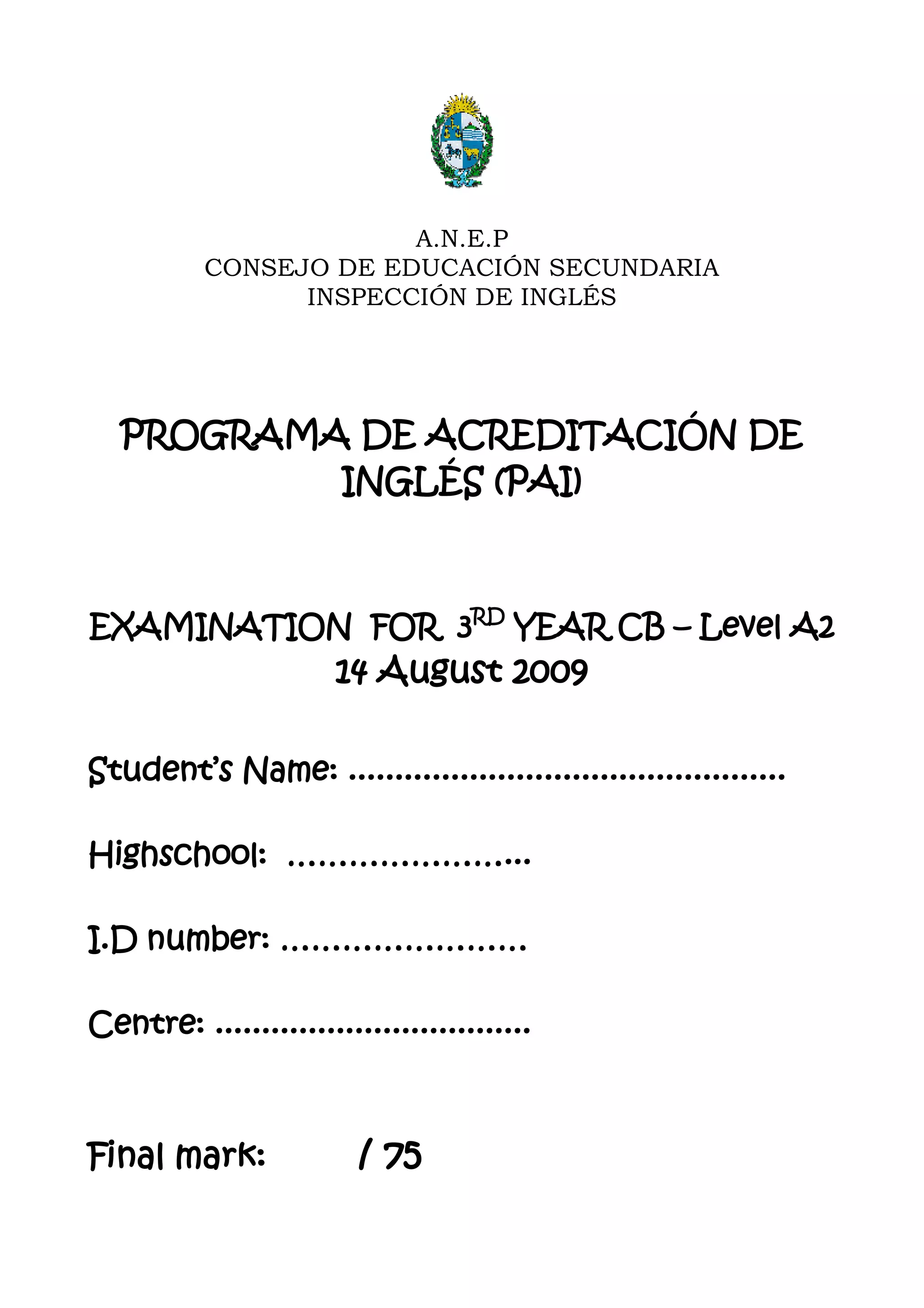 This document is an examination for a 3rd year English proficiency test. It contains a listening comprehension section with two passages and questions, a reading comprehension section with texts and related questions, an English in use section with grammar and vocabulary questions, and a reading section about animal behavior with true/false questions. The examination tests various essential English language skills through different question types and content.