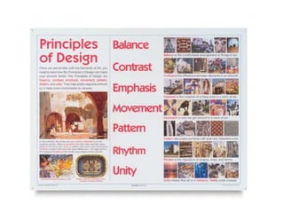 The visual arts final exam requires students to create 2 drawings, each demonstrating a different element or principle of art. The document provides examples of drawings focusing on line, shape, texture, movement, color, emphasis, unity, pattern, form, repetition, variety, space, and balance. It reminds students that their drawings must identify the element/principle and describe how it is used. Students are allowed to use their sketchbooks during the exam and can work in pencil, pen, markers, colored pencils, cut paper, or collage magazines.