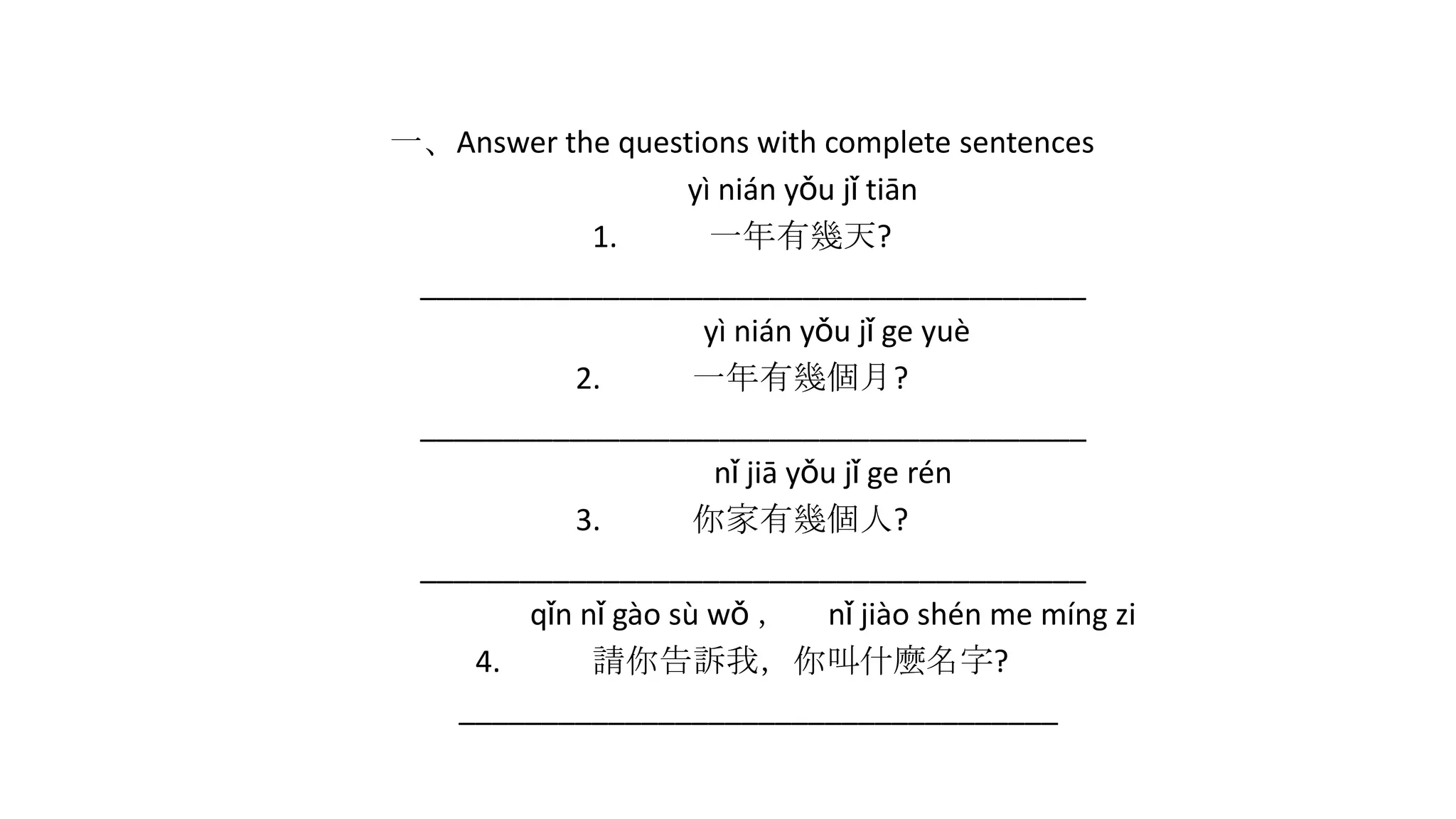 with complete sentences yì nián yǒu jǐ tiān 1. 一年有幾天? ________________________________________ yì nián yǒu jǐ ge yuè 2. 一年有幾個月? ________________________________________ nǐ jiā yǒu jǐ ge rén 3. 你家有幾個人? ________________________________________ qǐn nǐ gào sù wǒ , nǐ jiào shén me míng zi 4. 請你告訴我,你叫什麼名字? ____________________________________