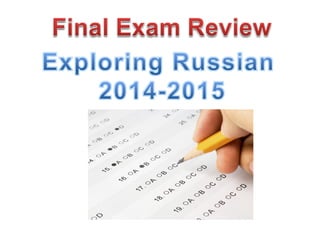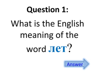 This document contains 40 questions and answers about basic Russian vocabulary such as numbers, letters, words for common objects, and phrases for basic communication. The questions cover topics like the Russian words for numbers, the English meanings of Russian cognates, the names of the Russian letters, and phrases to ask and answer basic questions. The answers provide both the target Russian words or phrases, and transliterations into the Latin alphabet for pronunciation.