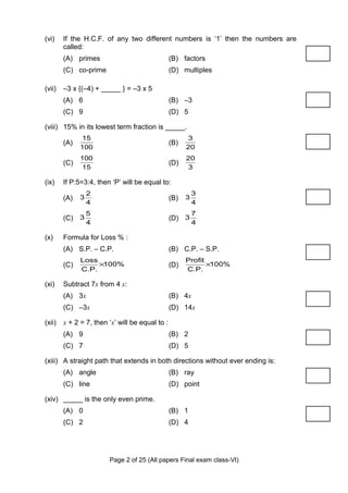 This document appears to be an exam for a 6th grade mathematics class. It contains instructions for a 3 hour exam divided into 3 sections worth a total of 100 marks. Section A is a 20 question multiple choice section to be completed in 30 minutes. Section B contains word problems worth 40 marks, with students to attempt 10 questions of 4 marks each. Section C contains longer word problems worth 40 marks, with students to attempt 5 questions of 8 marks each. The exam covers topics in mathematics including fractions, percentages, algebra, geometry and measurement.