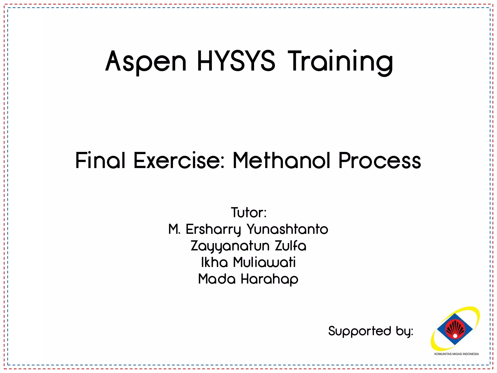 The document outlines a training exercise related to the methanol process using Aspen HYSYS, detailing components like CO2, hydrogen, methanol, and water. It provides specific parameters for the reaction, including kinetic parameters and operational conditions such as temperature and pressure. Additionally, it gives technical specifications for the reaction equipment, including dimensions and flow data.