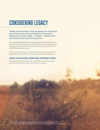 The document discusses final expense life insurance policies that can help cover funeral and other end-of-life costs. It notes that final expenses like funerals can cost thousands of dollars, but many Americans incorrectly believe that government programs will fully cover these costs. The document then provides details on three final expense life insurance policies - Immediate Solution, 10 Pay Solution, and Easy Solution - that offer coverage from $1,000 to $50,000 with no medical exams required. Riders are available to accelerate the payout for qualifying health issues. Worksheets are included to help estimate costs and determine the appropriate coverage amount.