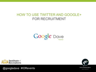 This document discusses how to use Twitter and Google+ for recruitment purposes. It provides tips on setting up accounts, engaging audiences, analyzing followers, using hashtags and tools to manage social media profiles. The document emphasizes using social media to reduce costs per hire, attract both active and passive candidates, build employer brand, and stay competitive. It also reviews why social media is important for businesses and how to capitalize on platforms like Twitter, Google+ and content marketing.