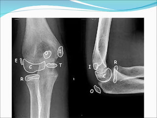 Lateral condyle fractures of the elbow are common in children between ages 6-10 years. They occur when a varus force is applied to an extended elbow. These fractures are prone to displacement and nonunion due to pull from forearm extensors and being bathed in synovial fluid. Treatment depends on the amount of displacement, with undisplaced fractures often treated non-operatively and displaced fractures requiring closed or open reduction and internal fixation. Complications can include ulnar nerve palsy, osteonecrosis, nonunion, and cubitus deformities.