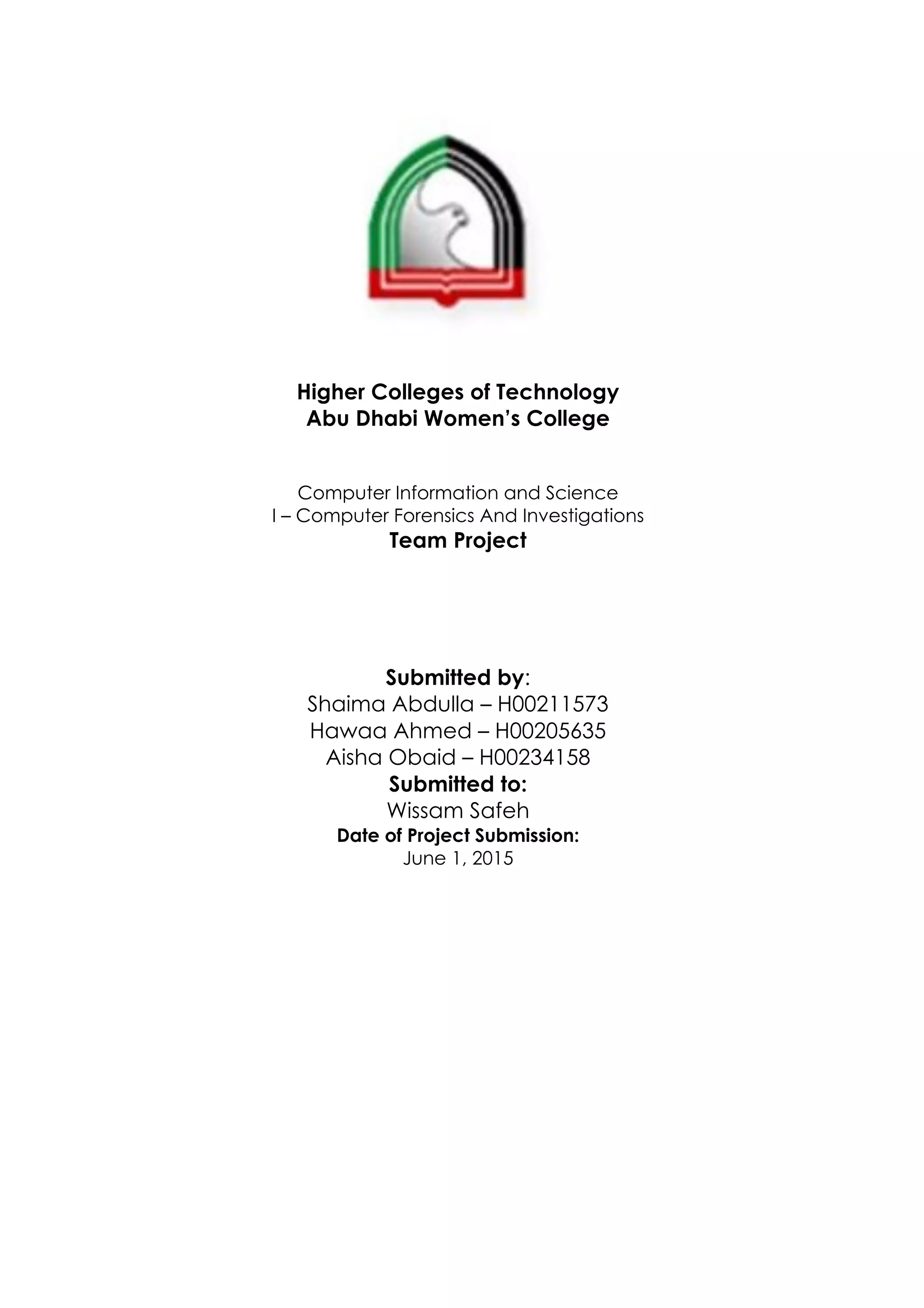 This document outlines a team project on computer forensics and investigations submitted by three students. It begins with an introduction on the importance of computer forensics in investigating civil and criminal cases. It then presents a problem statement describing a situation where confidential company information was leaked to a competitor, possibly via USB flash drive or email. The company wants to investigate by collecting evidence from the suspected employee's computer using forensics tools. The rest of the document includes sections on literature review, methodology, results and analysis of the findings using forensic tools like FTK and AccessData, discussion, and conclusion.