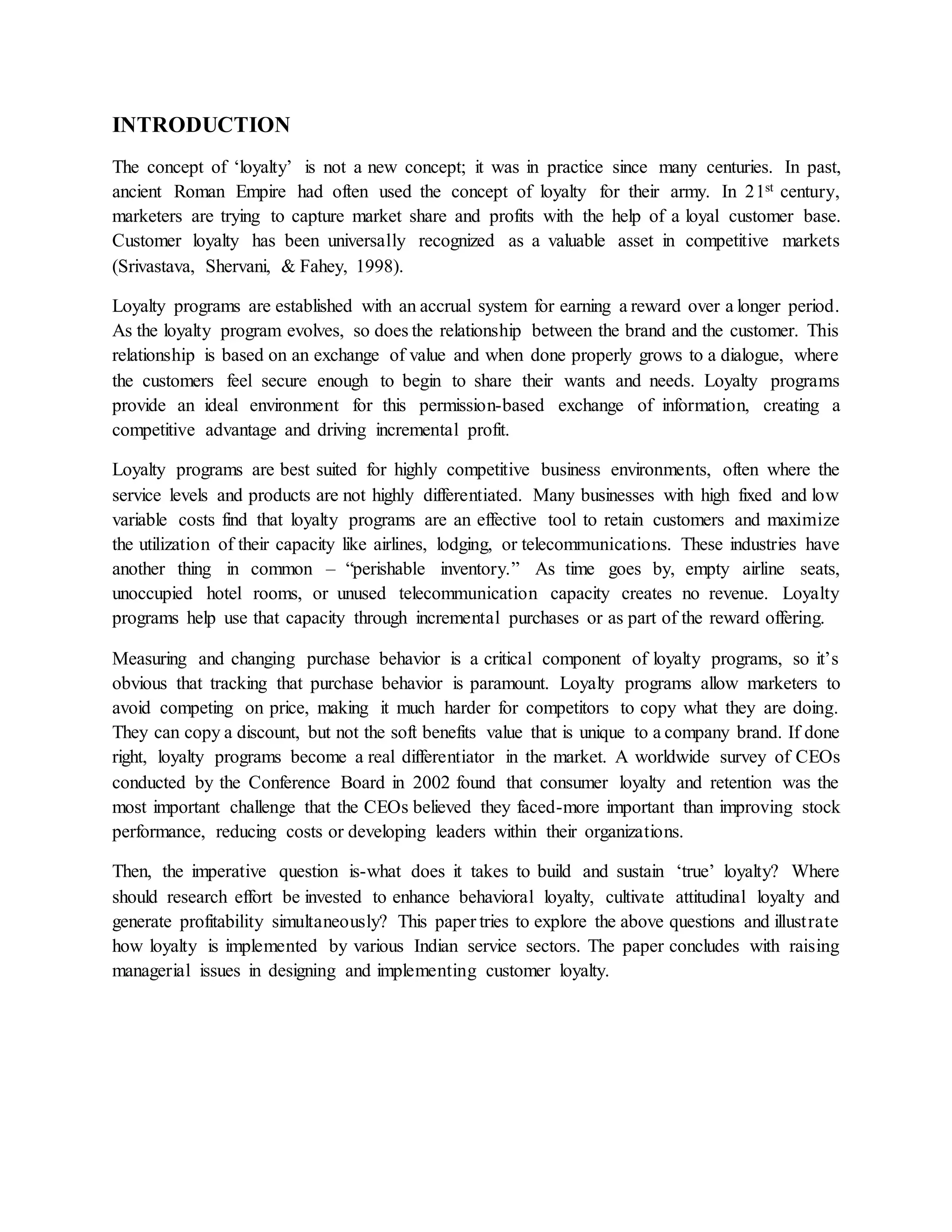 The document discusses customer loyalty programs. It defines loyalty programs as programs that allow customers to accumulate rewards for repeated purchases over time. Loyalty programs are best suited for competitive industries with undifferentiated products where retaining existing customers is important. They provide benefits to both customers and firms. For customers, they offer incentives and rewards for loyalty. For firms, loyal customers spend more on average and are less price sensitive, providing competitive advantages. Effective loyalty programs require tracking customer purchase data to customize rewards and communications.