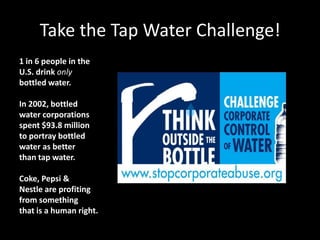1) The document presents arguments against bottled water, noting that corporations spend millions marketing bottled water as superior to tap water to drive profits.