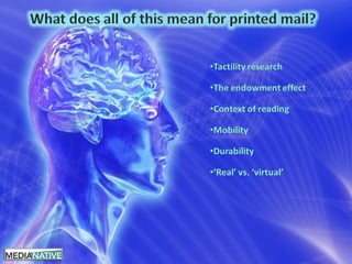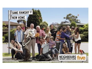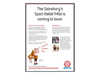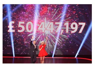The presentation discussed leveraging neighborhood effects in fundraising. It described different donor archetypes like "One Foot in the Grave" and "Desperate Housewives" that have preferences for certain fundraising channels like mail versus email. Segmenting donors this way allows targeting the most effective channels. Results from Comic Relief showed that increasing donor density through door drops led to 43% more fundraising miles completed with no extra marketing, indicating positive neighborhood effects.