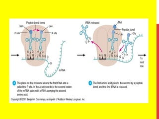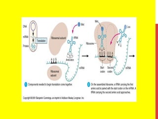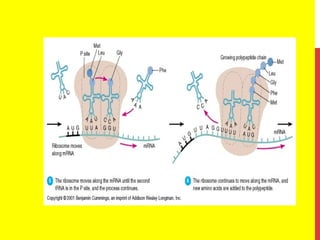This document discusses the structure and function of genetic material in microbes. It covers the basics of DNA and RNA structure, DNA replication, transcription, translation, the genetic code, and mechanisms of genetic transfer in bacteria. DNA is made of nucleotides with a phosphate, sugar, and nitrogenous base. It takes the form of a double helix. Bacterial DNA replication occurs via a replication fork that uses the parental DNA strands as templates. Transcription converts DNA into mRNA which is then translated into proteins. Mutation, transformation, conjugation, and transduction allow for genetic variation in bacteria.