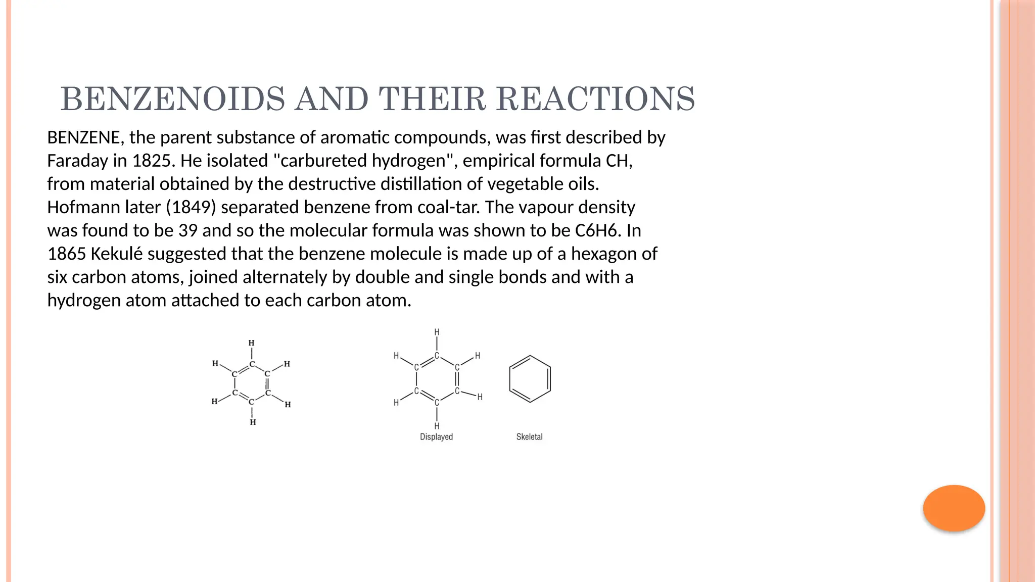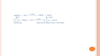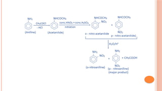The document discusses benzenoids, aromatic compounds, and their reactions, starting with the historical discovery of benzene and the concept of aromaticity, which describes the unique stability of cyclic, planar molecules with delocalized pi electrons. It covers the synthesis and classification of aromatic amino acids as well as the shikimate pathway, detailing their roles in plant metabolism and various applications in drugs, sweeteners, and industrial chemicals. The text also outlines the chemical properties and reactions of aniline, including electrophilic substitutions and its use in producing various products like pesticides and plastics.