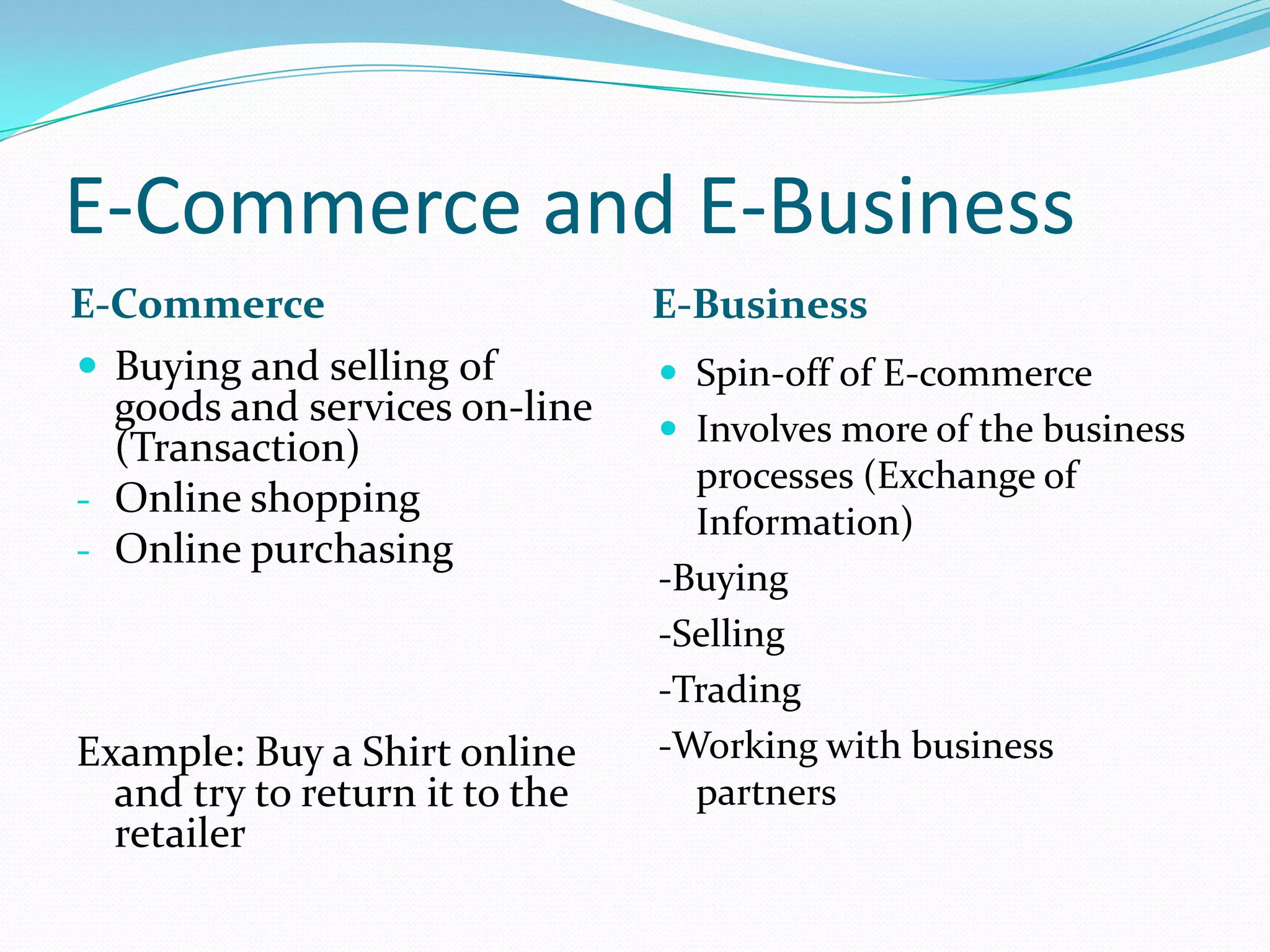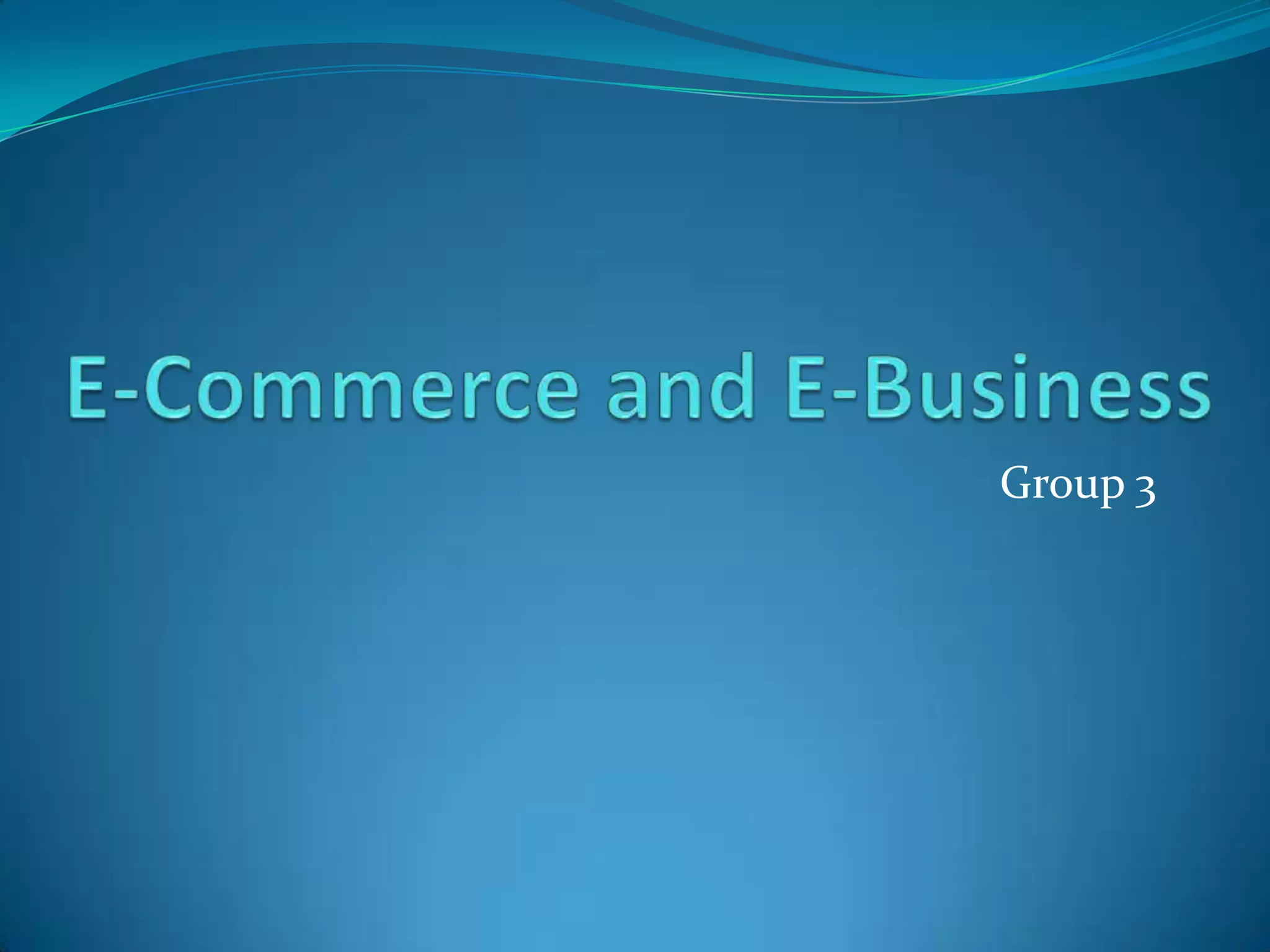 E-commerce involves online transactions, while e-business is broader and incorporates more business processes and information exchange. There are four main e-business models: business-to-business, business-to-consumer, consumer-to-business, and consumer-to-consumer. E-business impacts marketing by allowing consumers to research and shop anytime from anywhere, and allows for more personalized advertising. It also benefits supply chain management by moving from mass production to demand-driven and shortening supply chains. While e-business provides advantages like reduced costs, it also faces challenges like security and start-up expenses.
