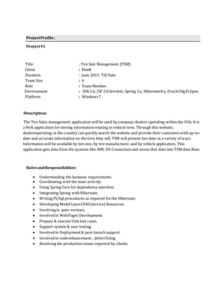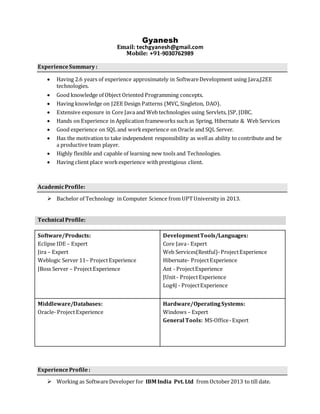 This document provides a summary of Gyanesh Pandey's experience and qualifications. He has over 2.5 years of experience in software development using Java and J2EE technologies. Currently working as a Software Developer at IBM India Pvt. Ltd since 2013. He has experience with frameworks like Spring, Hibernate, and Web Services. He has a Bachelor's degree in Computer Science and is proficient with technologies like Core Java, Oracle, SQL Server, Eclipse IDE, Jira, and more. He has worked on two projects, one for Ford involving tire sales management and one for Quest Diagnostics involving patient data management.