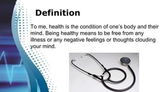 Health is defined as the condition of one's body and mind, meaning freedom from illness or negative thoughts. The author has generally been healthy but witnessed their grandmother's health deteriorate due to lung cancer. This experience made the author appreciate health and motivated them to pursue a career as a pharmacist to help others. A local pharmacist discussed in an interview how maintaining health requires personal responsibility and helps provide a better outlook. The Affordable Care Act aims to improve healthcare quality and accessibility in the US.