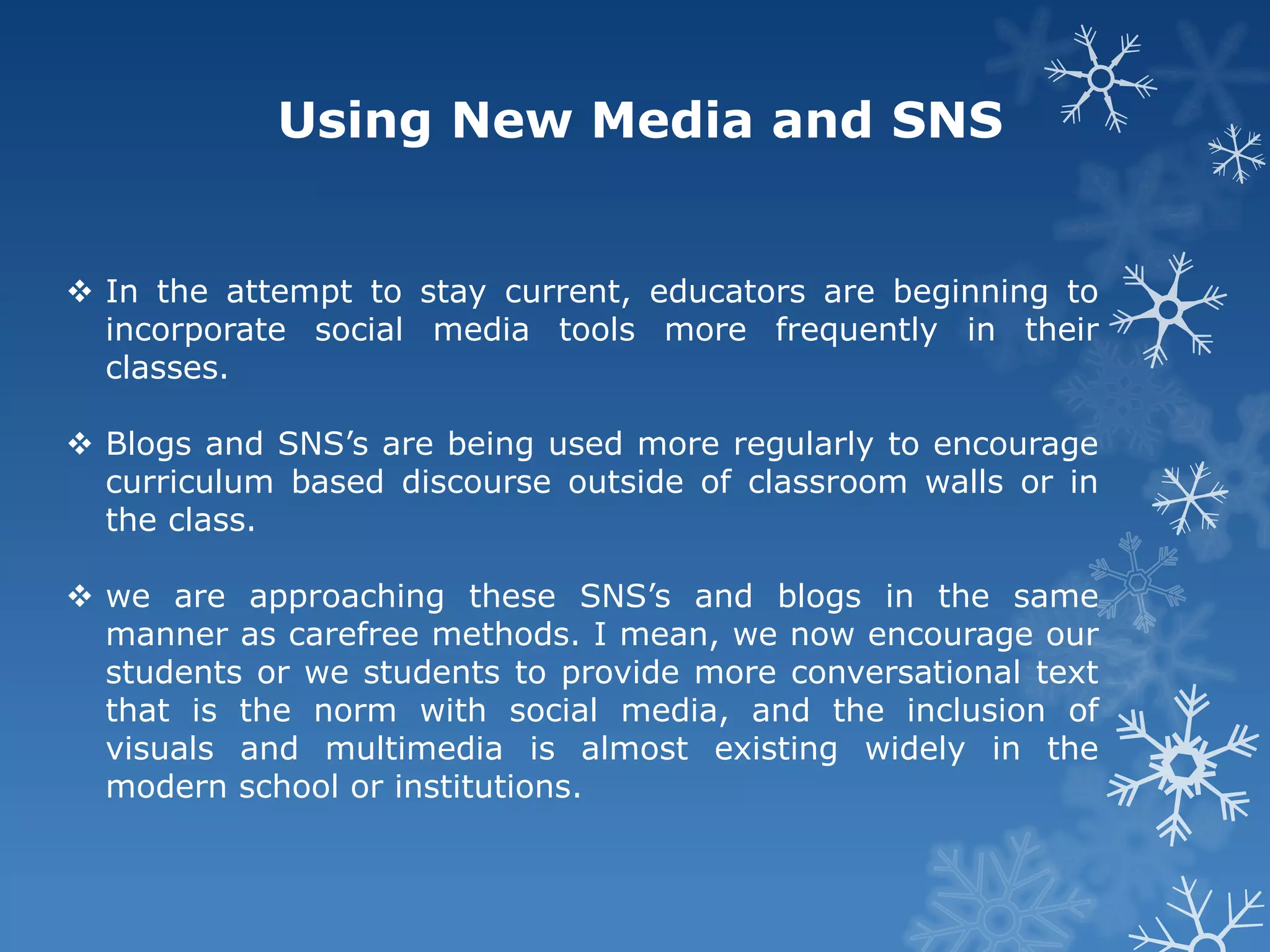 The document discusses the use of social media and new technologies in educational settings. It argues that while these tools are being incorporated more frequently, like PowerPoint, they are still being used in traditional ways focused on text. Educators should see new technologies as new literacies and genres, employing them in novel ways to encourage multimedia, visuals, and conversational discourse. The document also discusses using social media like Facebook in the classroom to make learning more collaborative and build collective intelligence among students. It outlines benefits of this approach, like promoting education and sharing information.