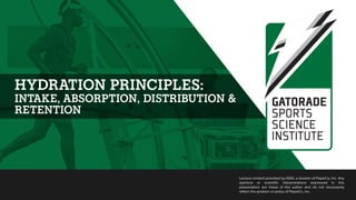 The document discusses key principles of hydration, including physiological importance of hydration, effects of dehydration on performance, factors influencing sweat rate, phases of fluid absorption and distribution, and recommendations for hydration and rehydration. It summarizes that sweating cools the body but dehydration impairs heat regulation, athletes should aim for less than 2% body weight loss, drinking plans should be based on sweat rates in hot environments, carbohydrates help with absorption without delaying emptying, and sodium aids fluid retention and distribution.