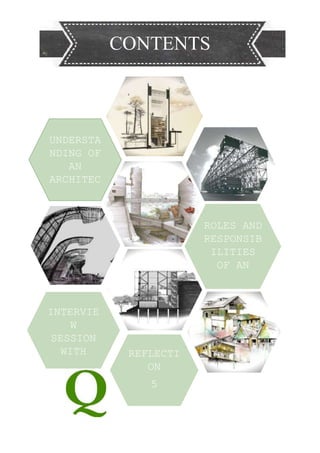 An architect must be trained and experienced in designing and planning buildings, as well as understanding structures, materials, aesthetics, costs, regulations, and client needs. They are responsible for presenting creative solutions to client briefs and seeing projects through from concept to completion. Architecture involves manipulating relationships between spaces, volumes, planes, masses and voids. Becoming an architect requires graduating high school, obtaining degrees from accredited universities, and completing training programs. The responsibilities of an architect are to provide sound advice to clients, respond accurately to briefs, produce design schemes, and represent clients' interests throughout the building process.