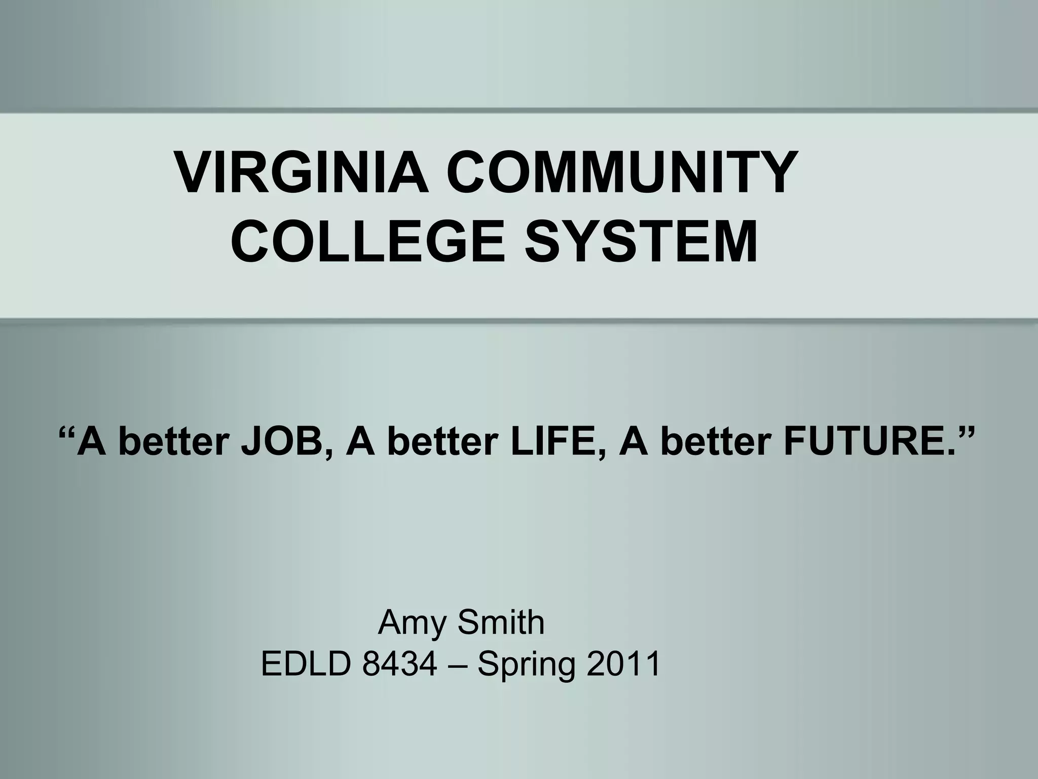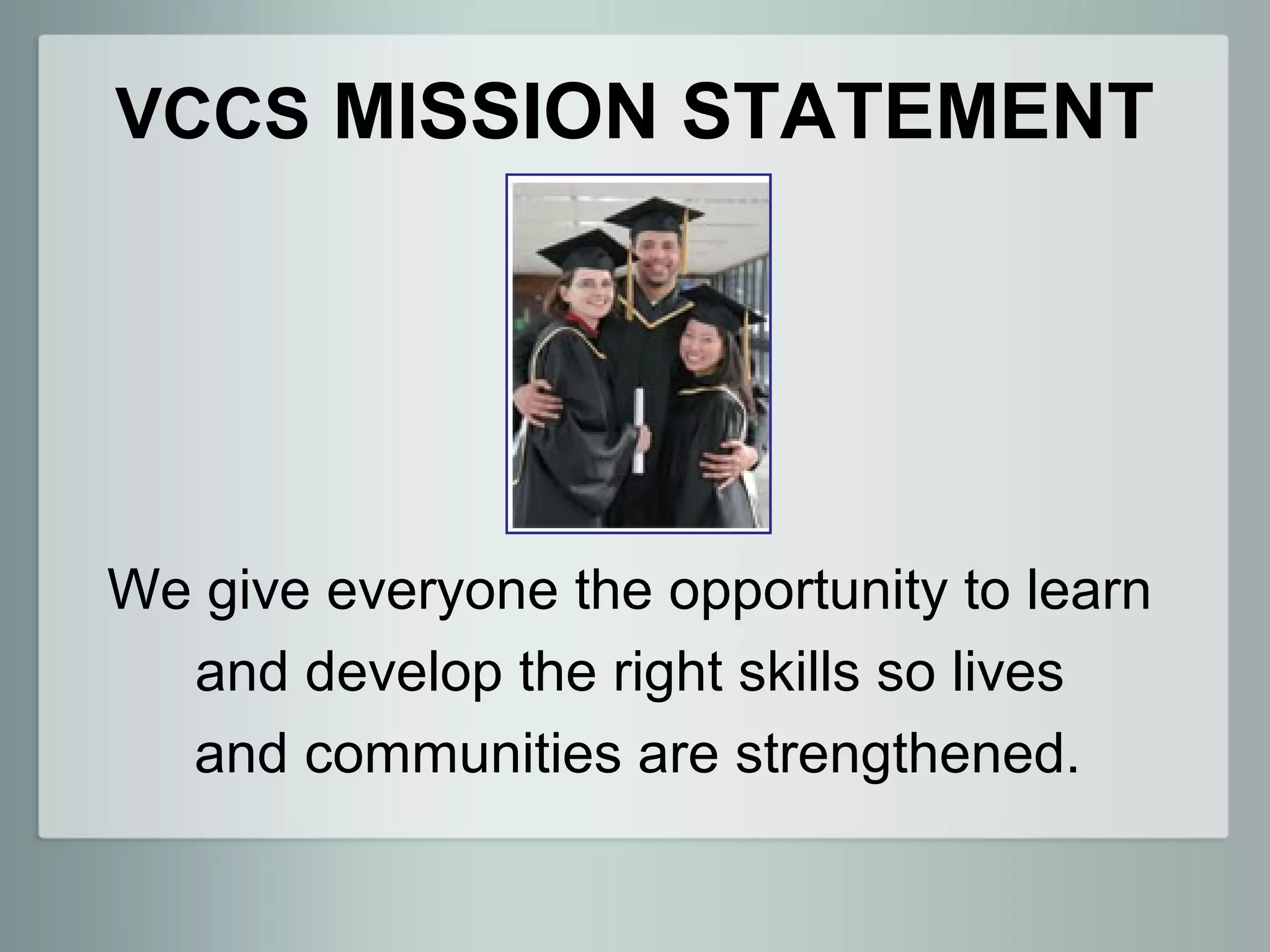 The document provides an overview of the Virginia Community College System (VCCS). It discusses the VCCS's mission of providing educational opportunities to strengthen lives and communities. It also summarizes the history and development of the VCCS since the 1960s. Statistics are presented on enrollment trends, student demographics, faculty employment, and educational outcomes like graduation and transfer rates. The roles of community colleges in workforce development, developmental education, and community education are also described.
