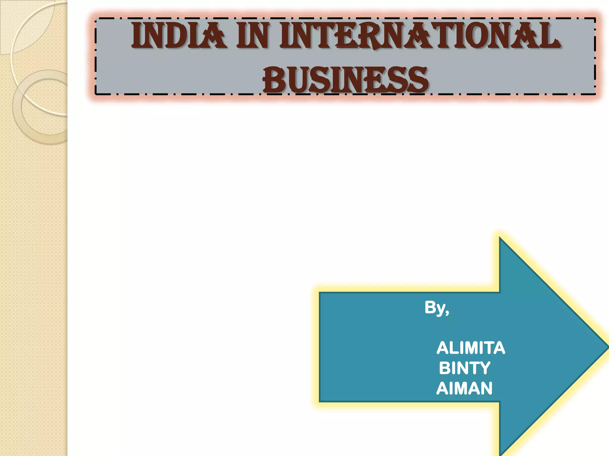 The document discusses international business opportunities in India. It notes that India has high-skilled labor and a growing middle class, making it attractive for business. However, a uniform strategy is not advisable due to cultural diversity across regions. Several sectors like IT, pharmaceuticals, and infrastructure have potential. Bodies like CII and FICCI help foster international ties and make policy recommendations. Overall, international business in India is growing significantly and future prospects are positive.