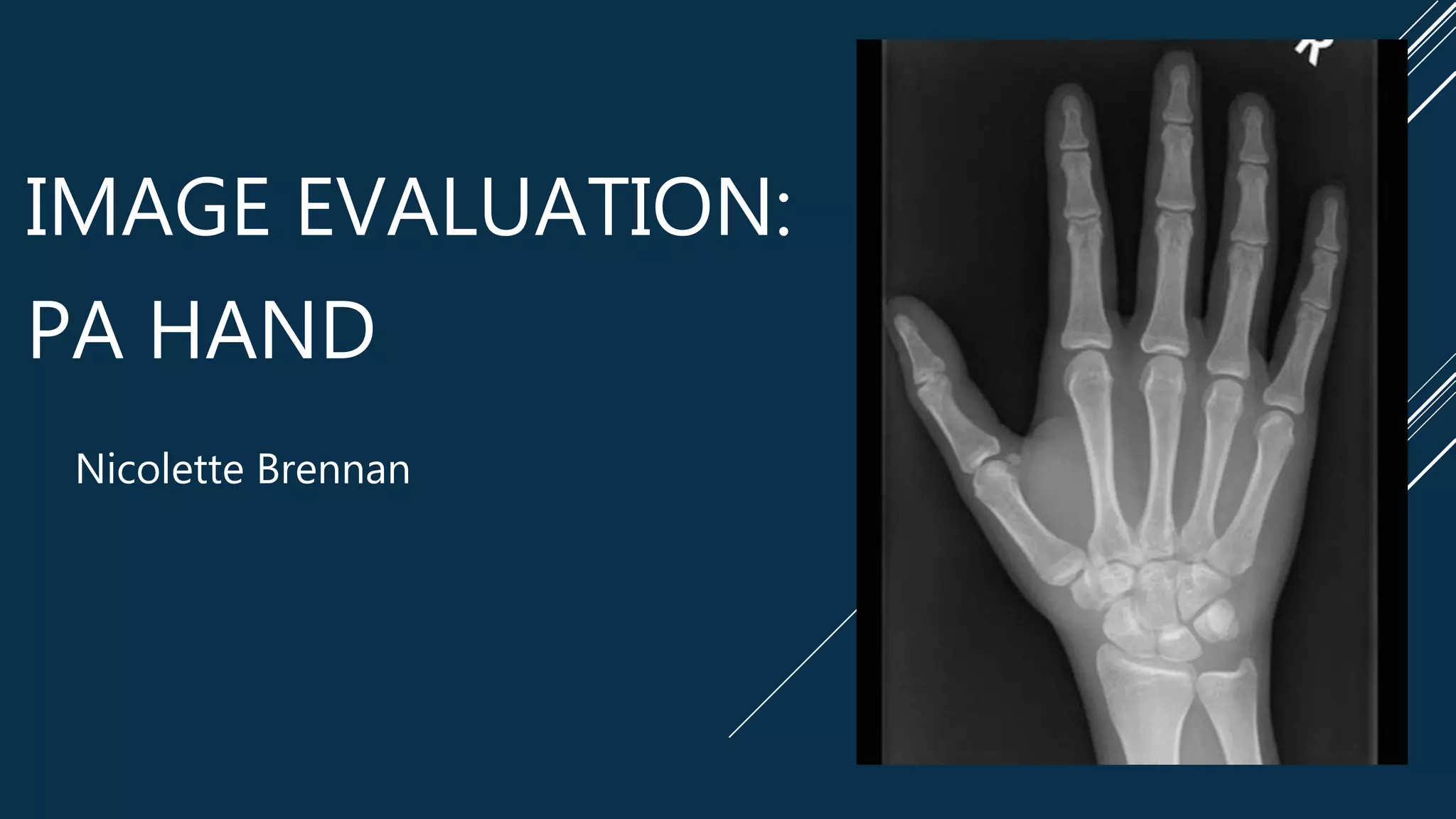 This image evaluation provides a detailed analysis of a PA hand x-ray image based on standards of HIPAA compliance, marker and patient identification, radiation hygiene, completeness of positioning/projection, artifact identification, image sharpness, accurate part positioning, and judicious exposure technique. While meeting minimum acceptance criteria, the summary identifies areas for improvement, including inclusion of soft tissue, proper marker and technologist identification, collimation on three sides, and centering of the CR. The evaluator recommends accepting the image with corrections.
