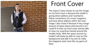 The document discusses image choices for different sections of a magazine. For the front cover, the author chose an image of a model giving direct address to allow space around it for coverlines. For the contents page, the author chose the first image because it could anchor to a page number and the models' positions fit better there than a double page spread. For the double page spread, the author chose four images that show the models having fun and reinforce the article's topic that musicians are just like regular people, subverting rock star stereotypes. All images reinforce the magazine's rock genre.