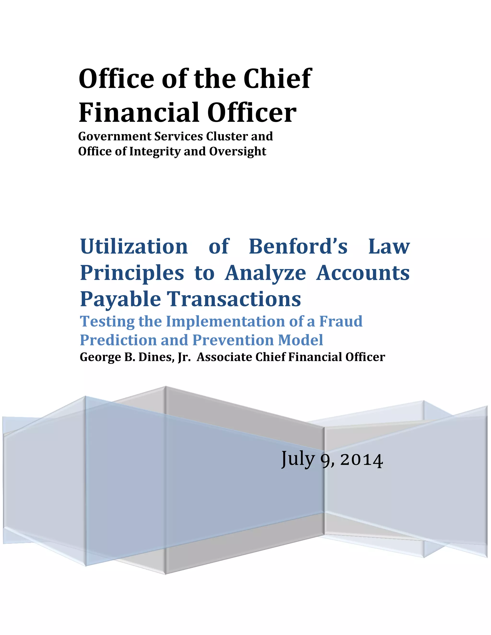 This document discusses using Benford's Law, a mathematical theory of leading digits, to analyze accounts payable transactions data from the District of Columbia's Department of Transportation for fiscal year 2013. Benford's Law predicts the distribution of leading digits in data sets and can help detect fraud by identifying anomalies. The document provides an overview of Benford's Law and its constraints, and presents a pilot analysis of the Department of Transportation disbursement data, which had 5,131 transactions totaling $376 million. Going forward, the methodology will be discussed with the Office of Integrity and Oversight to develop proper policies and procedures for using this fraud detection technique.