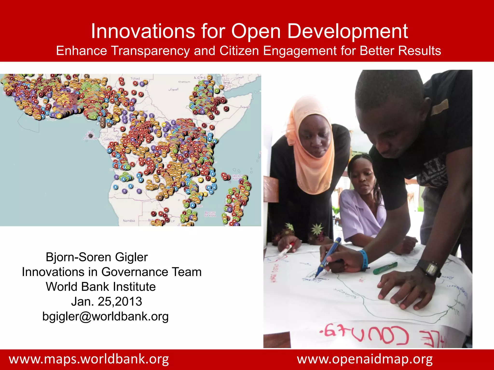 The document discusses innovations for open development aimed at enhancing transparency and citizen engagement in monitoring World Bank operations and results. Key objectives include improving data visualization through geo-coding, establishing feedback loops for citizen input, and supporting accountability mechanisms in various sectors. It highlights successful mapping initiatives across multiple countries and the implementation of citizen feedback systems to inform development outcomes.