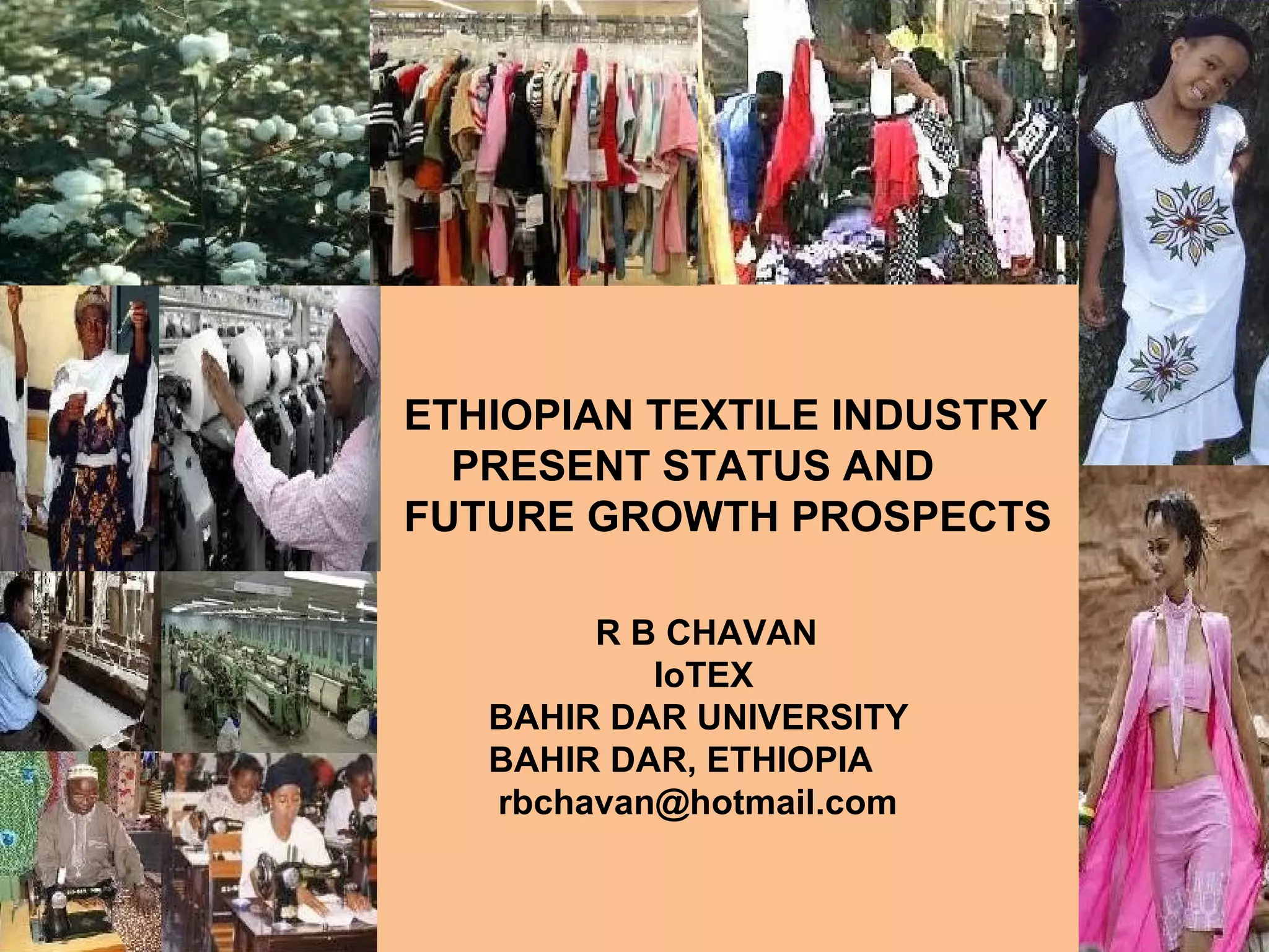 The document summarizes the present status and future growth prospects of Ethiopia's textile industry. It discusses the cotton sector, textile sub-sector, and garment sub-sector. Regarding cotton, it notes that only 3.6% of suitable land is currently used, and there is potential to increase production. The textile industry includes outdated mills that need upgrading. The garment sector focuses on exports and works primarily on a cut-make-trim model. Improving productivity, quality standards, and moving into design/retail could help future growth.