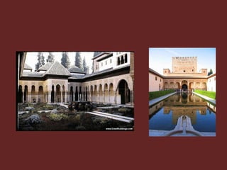 The document discusses various styles of Islamic architecture found in palaces across India and other regions. It provides details on the distinctive Mughal style seen in buildings like the Taj Mahal and Fatehpur Sikri. Key elements of Mughal palaces are described, such as arched entrances, balconies, domes, and elaborate carvings/decorations featuring geometric and floral patterns. Specific historic palaces from India demonstrating these styles are also outlined.