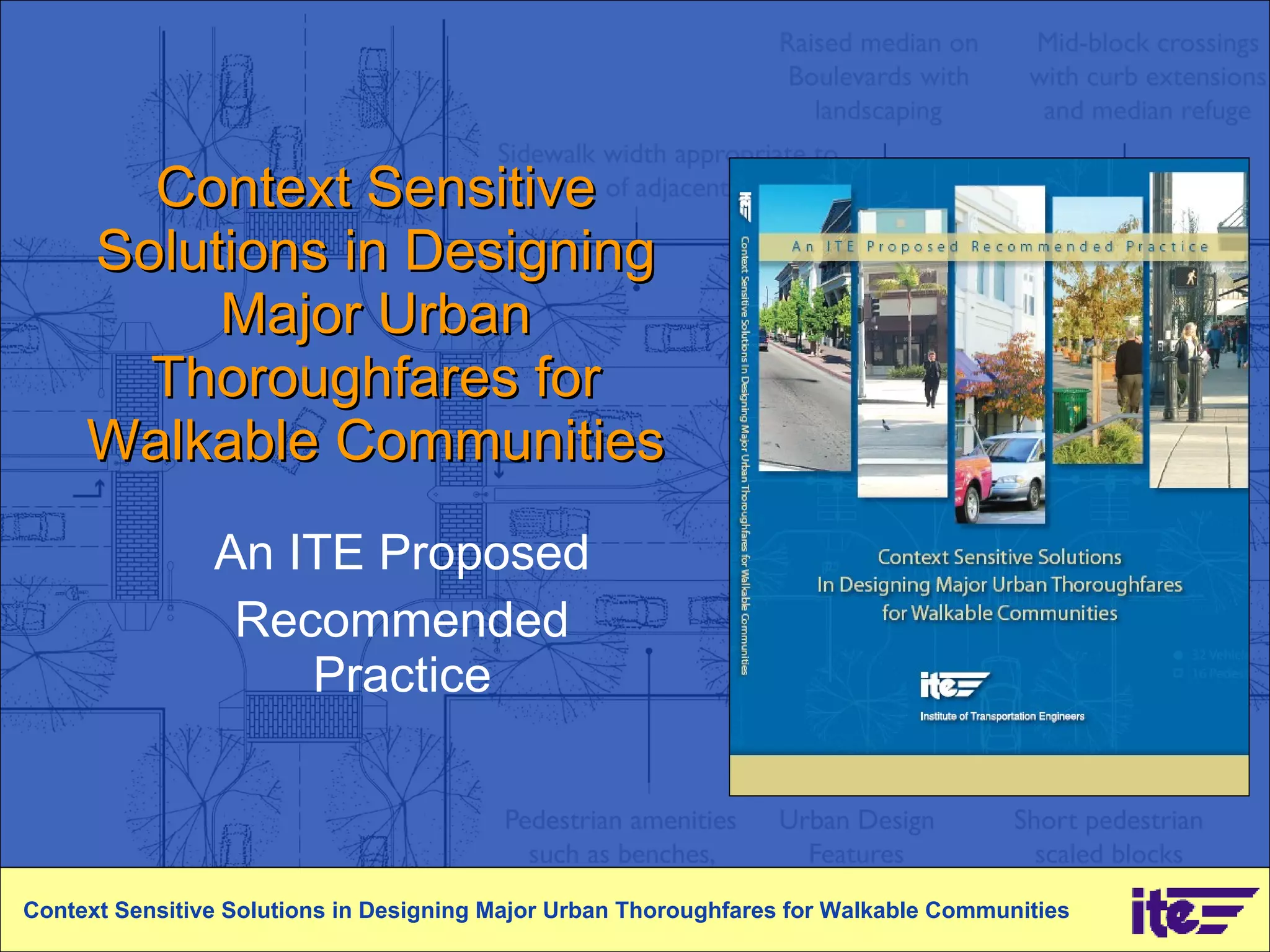 The document discusses context sensitive solutions (CSS) for designing major urban thoroughfares to be more walkable. It proposes CSS principles for planning, outlines a design framework considering context zones and street types, and provides guidance on roadside, traveled way, and intersection design tailored to land use and community objectives. The recommendations are intended to help transportation professionals design streets that balance safety, mobility, and the surrounding community.