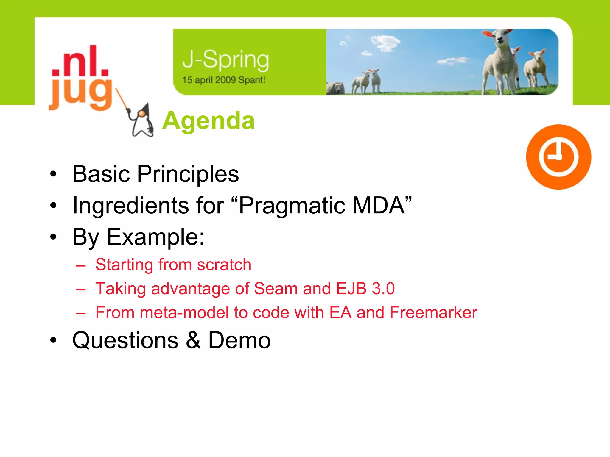 The document discusses a pragmatic approach to model-driven architecture (MDA) for developing Java EE applications. It describes building platform-independent and platform-specific models, then transforming models into code. The speakers provide examples of applying MDA principles like defining a target architecture and domain model to generate artifacts like entity classes and data access objects from UML stereotypes using a template engine.