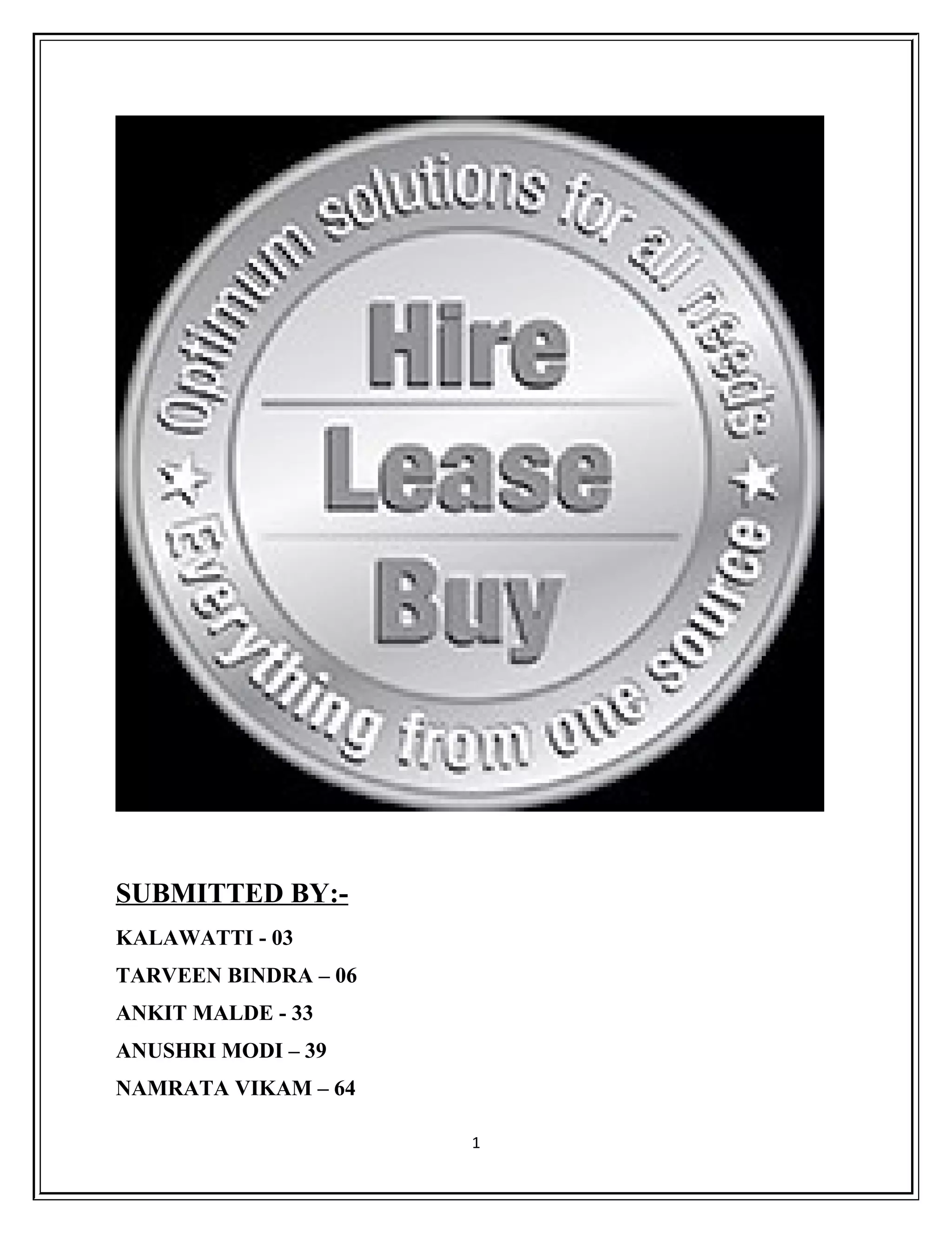 This document provides an overview of leasing and hire purchase agreements. It discusses the history and types of lease agreements including financial leases, operating leases, sale and lease back, leveraged leasing, and direct leasing. It outlines the advantages of leasing such as saving capital, flexibility, planning cash flows, and tax advantages. It also discusses the disadvantages of leasing including early termination penalties, higher insurance costs, lack of ownership, and long term expenses. Examples of leasing companies in India are provided. Hire purchase agreements are also introduced as a similar financing method.