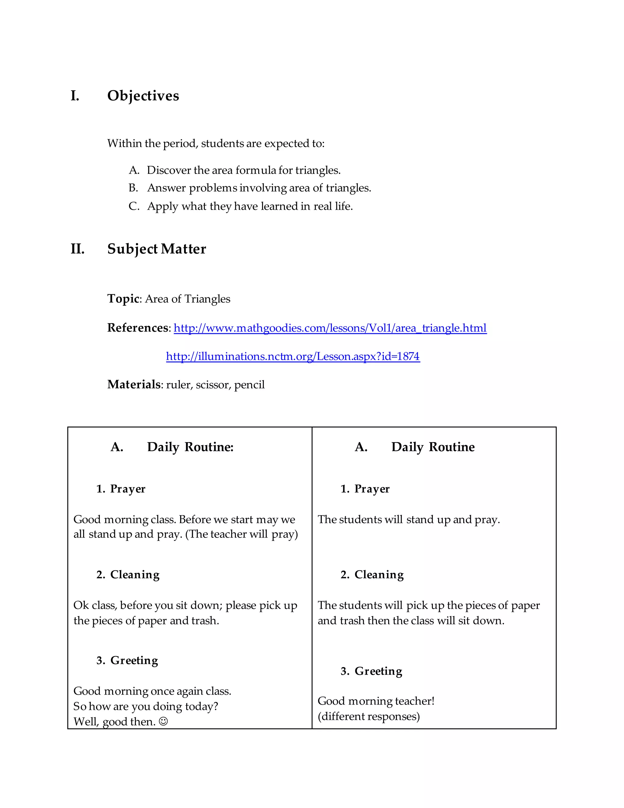 1. The document outlines a teacher's daily lesson plan on teaching students about the formula for calculating the area of triangles.