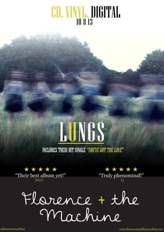 The document promotes the album "Lungs" by Florence + the Machine, which includes their hit single "You've Got the Love". It provides the release date of the album, ways to purchase (CD, vinyl, digital), the band's website and Twitter handle, and positive reviews praising it as their best album yet.