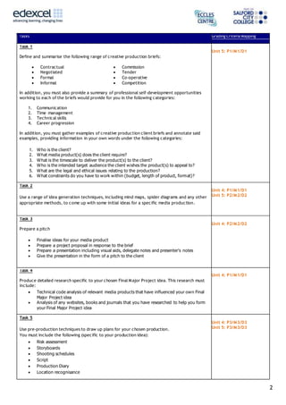 This document outlines the tasks and criteria for a media production student's final major project. The student must independently develop, plan, produce, and evaluate an original media product in response to a brief. Specifically, the student will: