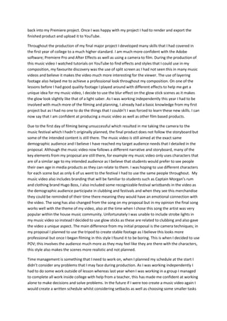 3) Although issues with the first filming caused changes from the original plan, the student believes the final video still appeals to its target demographic of students interested in house music, festivals, and clubbing. They received positive feedback, especially from friends