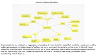 1) The document discusses the process of uploading and distributing a podcast titled "Birdsong: The Call of the Natural World" across multiple platforms after initial difficulties uploading to YouTube. Anchor and Spotify were chosen as primary hosting platforms.