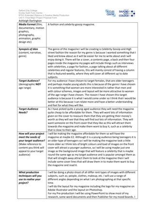 1) Ashleigh Darlington proposes creating a fashion and celebrity gossip magazine as her final major project.