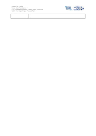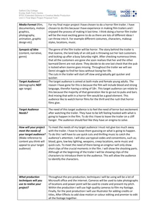 The student is proposing a horror film trailer for their final media project. The trailer will follow a pub landlady and barmaid who realize they are not alone after closing time. Throughout the trailer, the barmaid will struggle to find her missing boss without being killed. The target audience is young male and female adults who enjoy pubs/bars and horror films for thrill and excitement. To appeal to this audience, the trailer will use quick cuts, thrilling music, and leave viewers guessing through a cliffhanger ending. Production techniques will include location photography, pitch presentations, high quality filming, and post-production software like Illustrator, After Effects, and Premiere Pro.