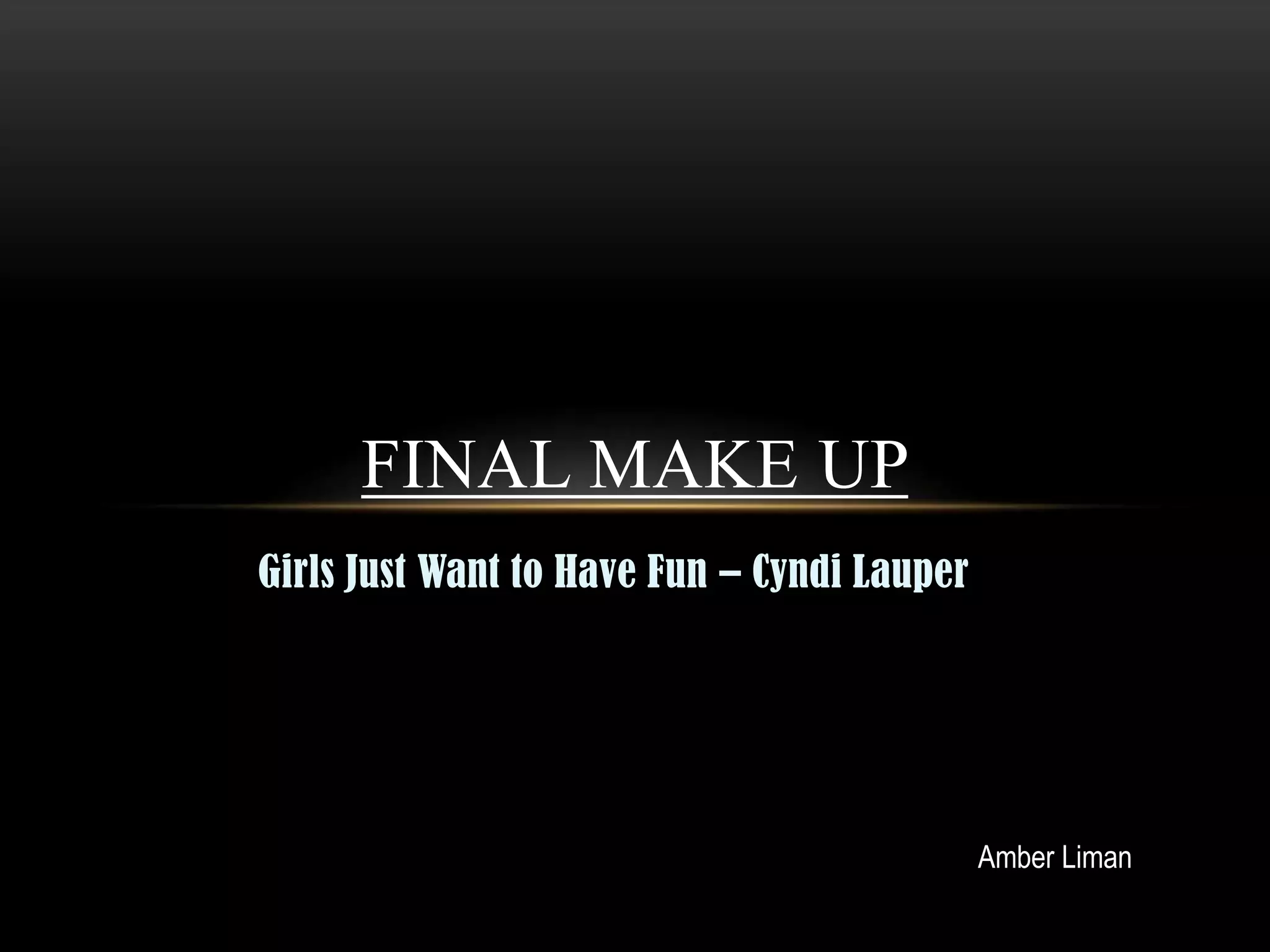 The document discusses the makeup choices for various scenes in a music video for the song "Girls Just Want to Have Fun". For the main scenes, a dramatic red lip and bold eye makeup was chosen to make the main character stand out. Simple makeup was used for bedroom scenes to look more natural. Glittery lip makeup was applied for ski slope scenes to look dramatic and winter-themed. Different hair and makeup styles were designed for supporting characters to contrast with the main character and enhance various scenes. Before and after photos showed the transformation from natural to finished makeup looks.