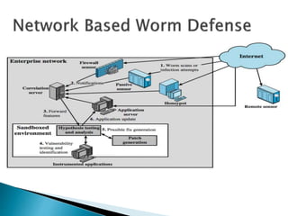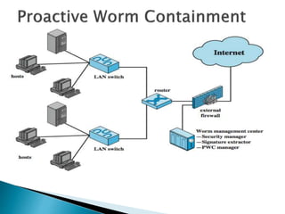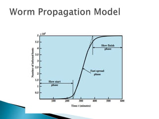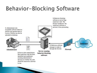 This document discusses different types of malicious software including viruses, trojan horses, worms, and spyware. It provides details on how each type spreads and the harm they can cause. Viruses spread by infecting other files or programs and can corrupt data or disrupt systems. Trojan horses disguise harmful programs as legitimate ones. Worms replicate across networks and can delete files or disrupt systems. The document outlines strategies for prevention, detection, and removal of malicious software.