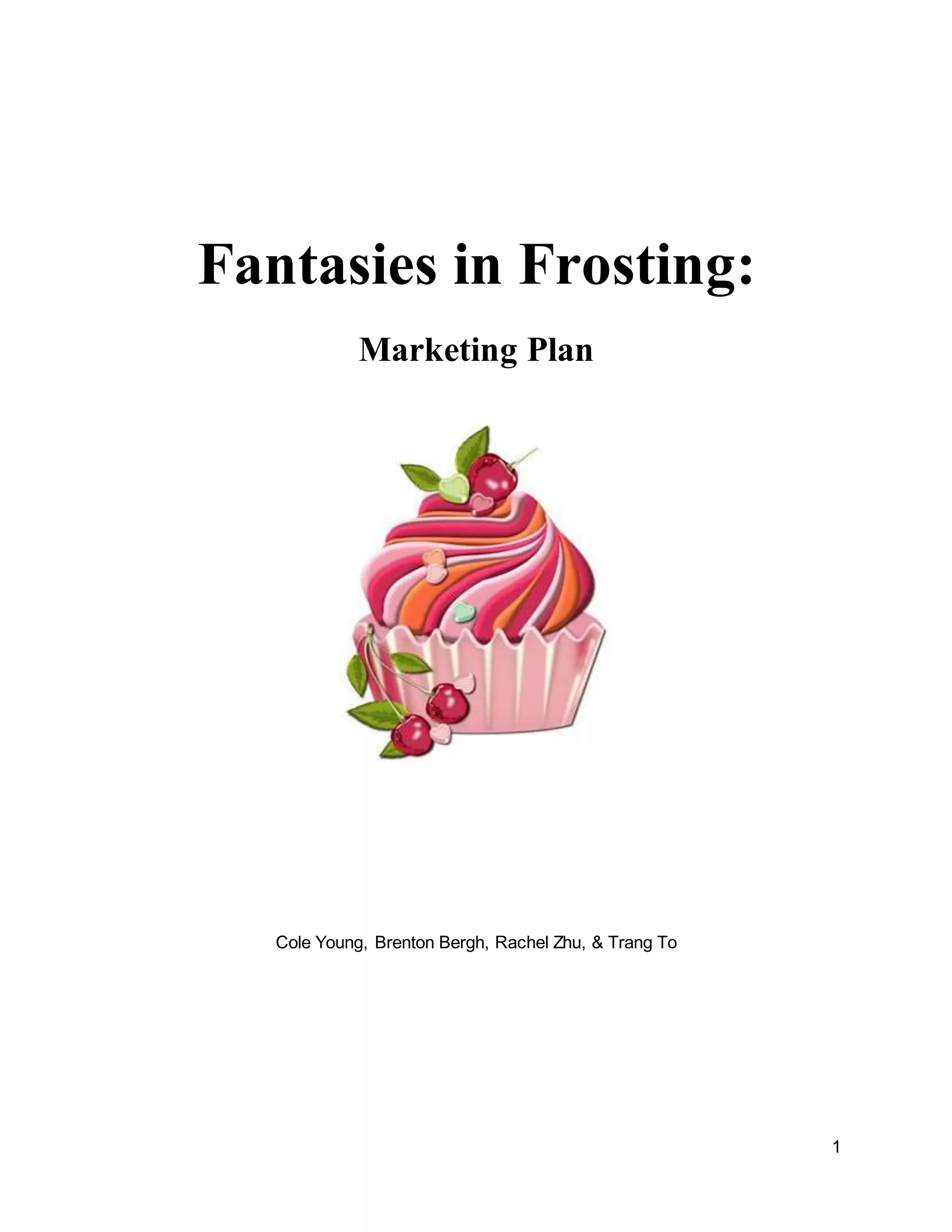 The document outlines a marketing plan for 'Fantasies in Frosting', a bakery targeting affluent consumers who desire elegant pastries in a sophisticated environment. The business aims to leverage its existing reputation in the wedding cake market and achieve a market share of 25% within 10 years while facing challenges from local competitors. The bakery plans to emphasize product differentiation, a unique atmosphere, and effective promotional strategies to attract its target demographic of high-income women.