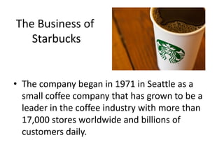 Starbucks proposes an online marketing campaign to highlight its environmental, ethical, and community responsibility. The campaign would utilize social media like Twitter and Facebook daily to share Starbucks' efforts and engage customers. It would also feature bi-weekly blogs showcasing responsible actions. The goal is to positively influence perceptions of Starbucks and potentially increase store visits and donations. The budget for the social media implementation is low, but $10,000 per month would be allocated for new responsible initiatives.